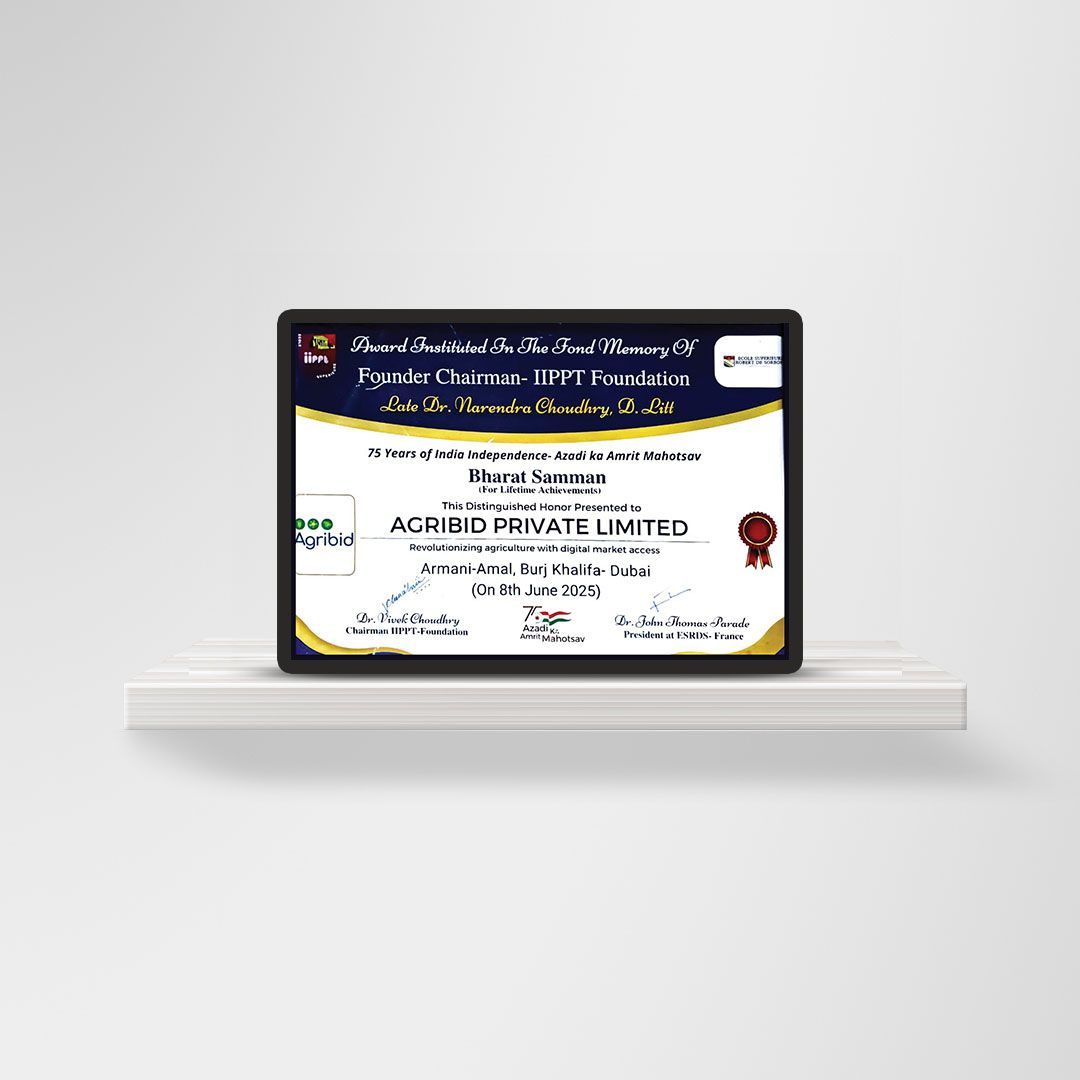 Awarded the Bharat Samman at Burj Khalifa, Dubai for revolutionizing agriculture through digital market access and our impactful work in the agri sector.